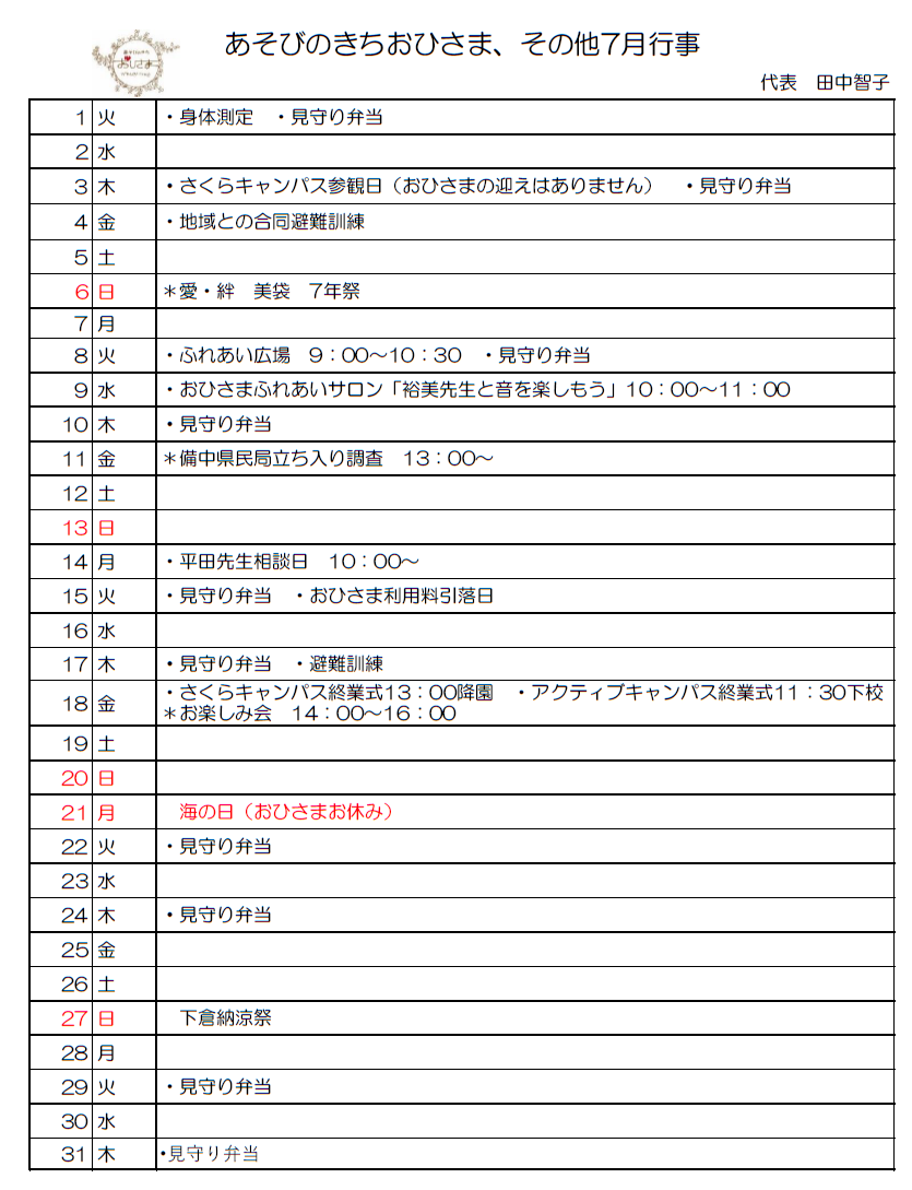 令和7年7月の予定表